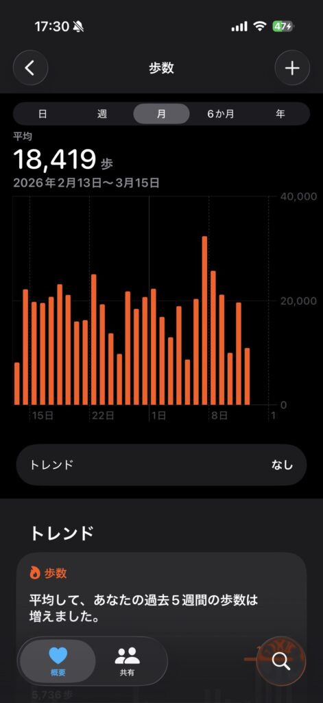 旅行中は極力タクシーなどをつかわず歩くようにしているので旅行中での1日平均歩数は18,419歩でした。